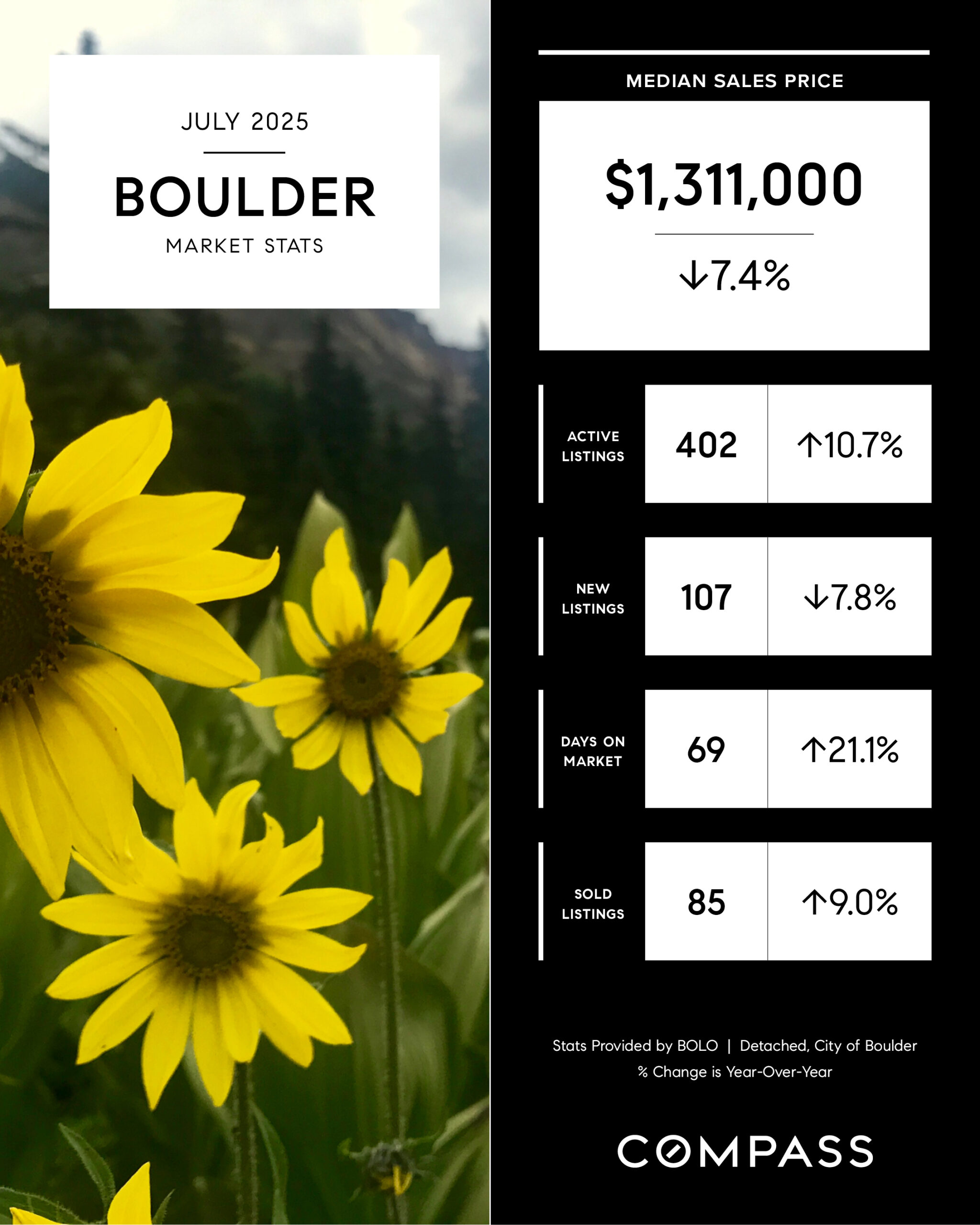 Message: Boulder’s market is shifting, but activity remains strong. More homes are hitting the market, sales are up, and while prices are adjusting, buyers and sellers both have opportunities. Want to know how this impacts your next move? Reach out or read more at bit.ly/boulderstats-july25