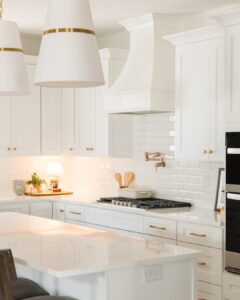 Clean tile, warm brass, and soft lighting bring just enough warmth into a space that could easily feel cold this time of year.